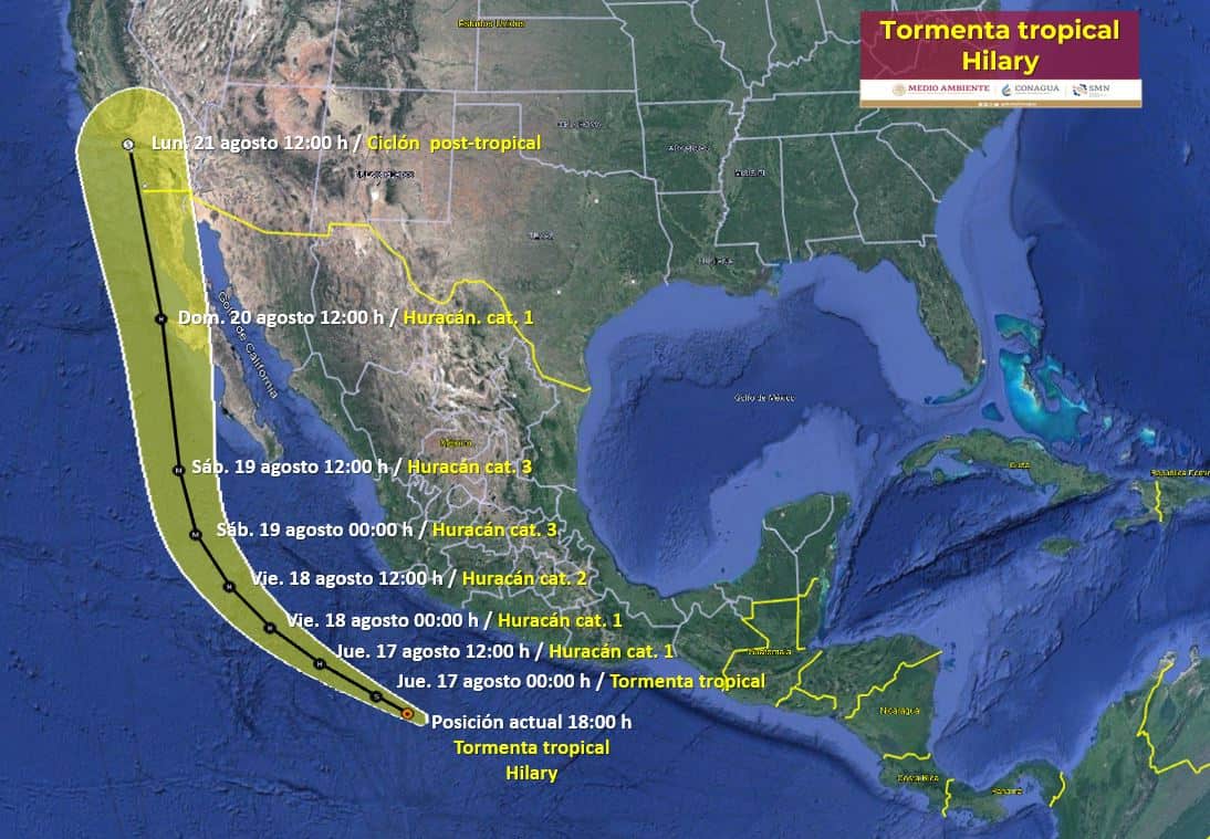 La tormenta tropical Hilary mantendrá lluvias fuertes a puntuales intensas, fuertes rachas de viento y oleaje elevado en el sur y occidente de la República Mexicana.