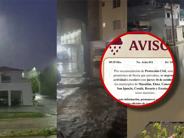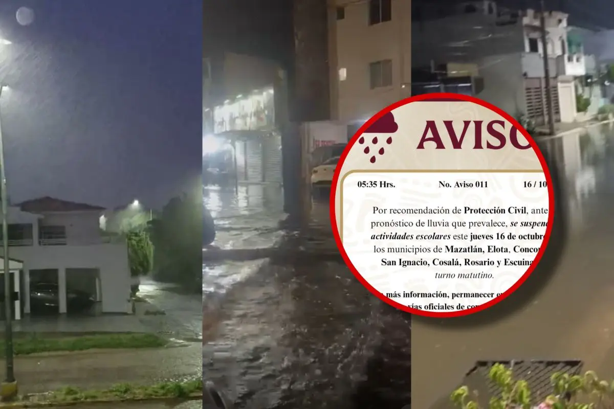 "Por recomendación de Protección Civil, ante el pronóstico de lluvia que prevalece, se suspenden actividades escolares este jueves 16 de octubre en los municipios de Mazatlán, Elota, Concordia, San Ignacio, Cosalá, Rosario y Escuinapa, turno matutino. Para más información, permanecer en atención de las vías oficiales de comunicación".
